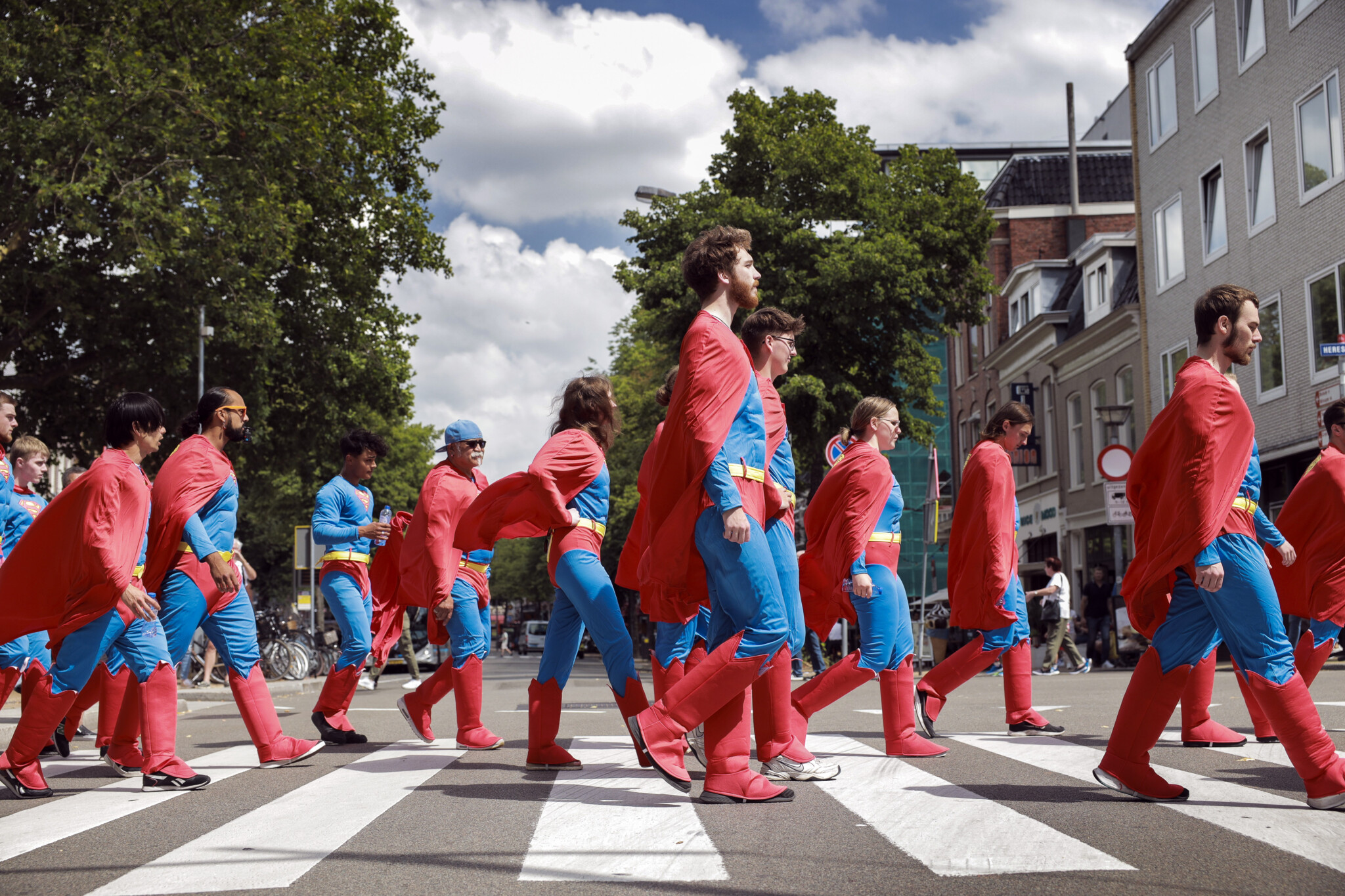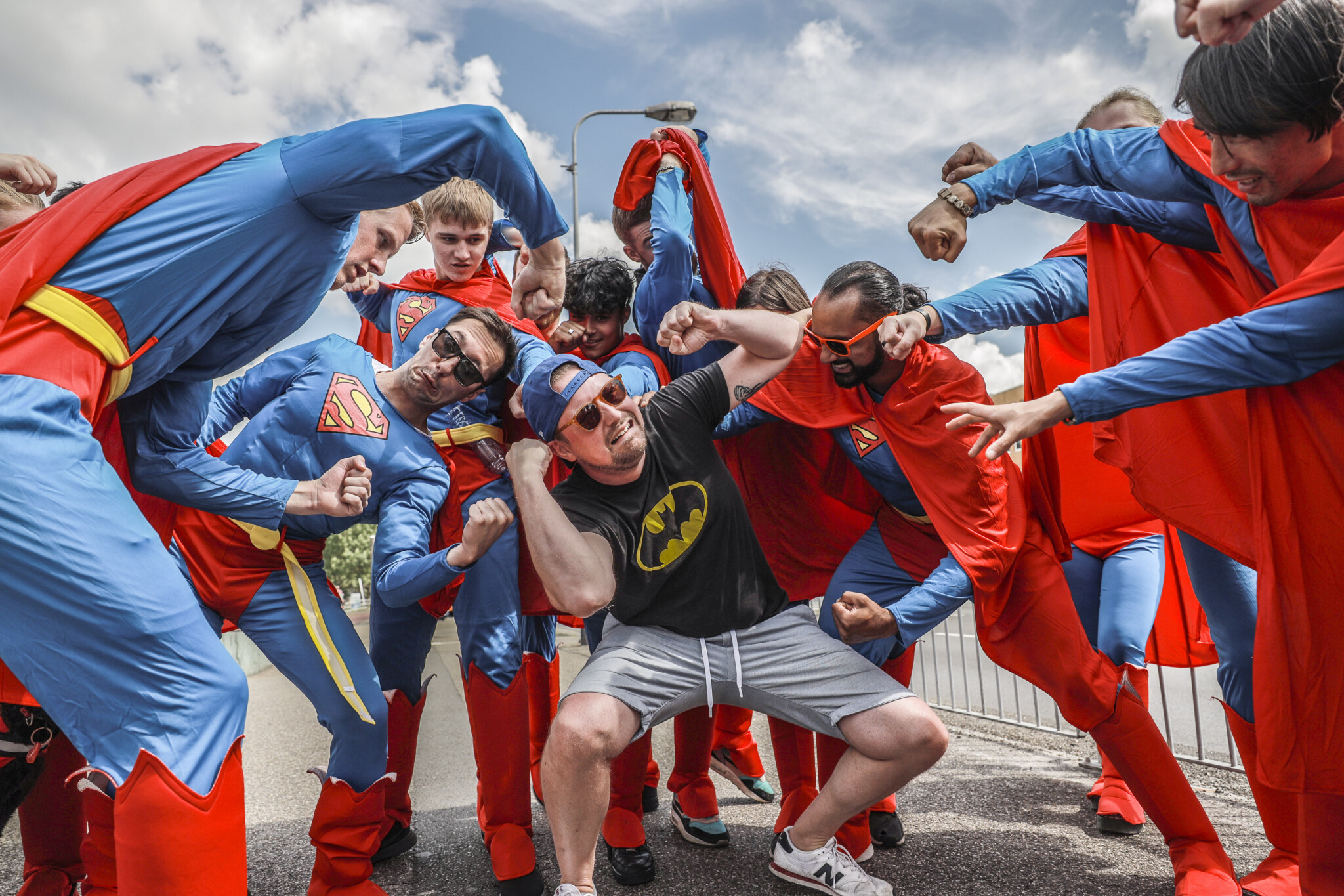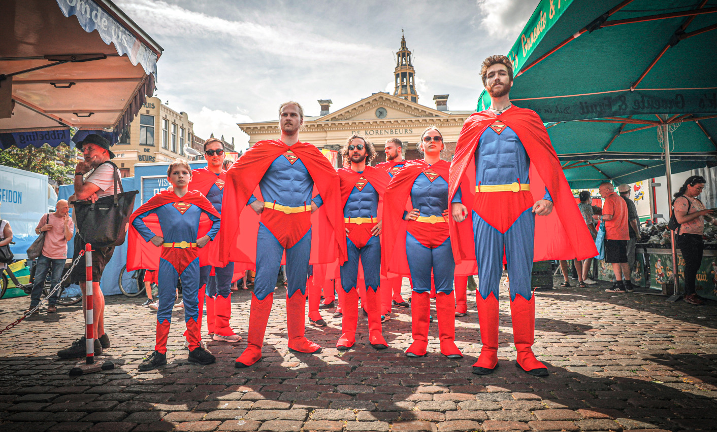 Maar zomaar de stad in sturen voor wat aandacht voelde te braaf. Dus maakten we er een opdracht van. Eén moment. Eén startsein. Vijftig superhelden tegelijk de stad in. Een overload. Geen uitleg, geen bordjes, alleen het beeld. Camera’s erachteraan en kijken wat er gebeurt.